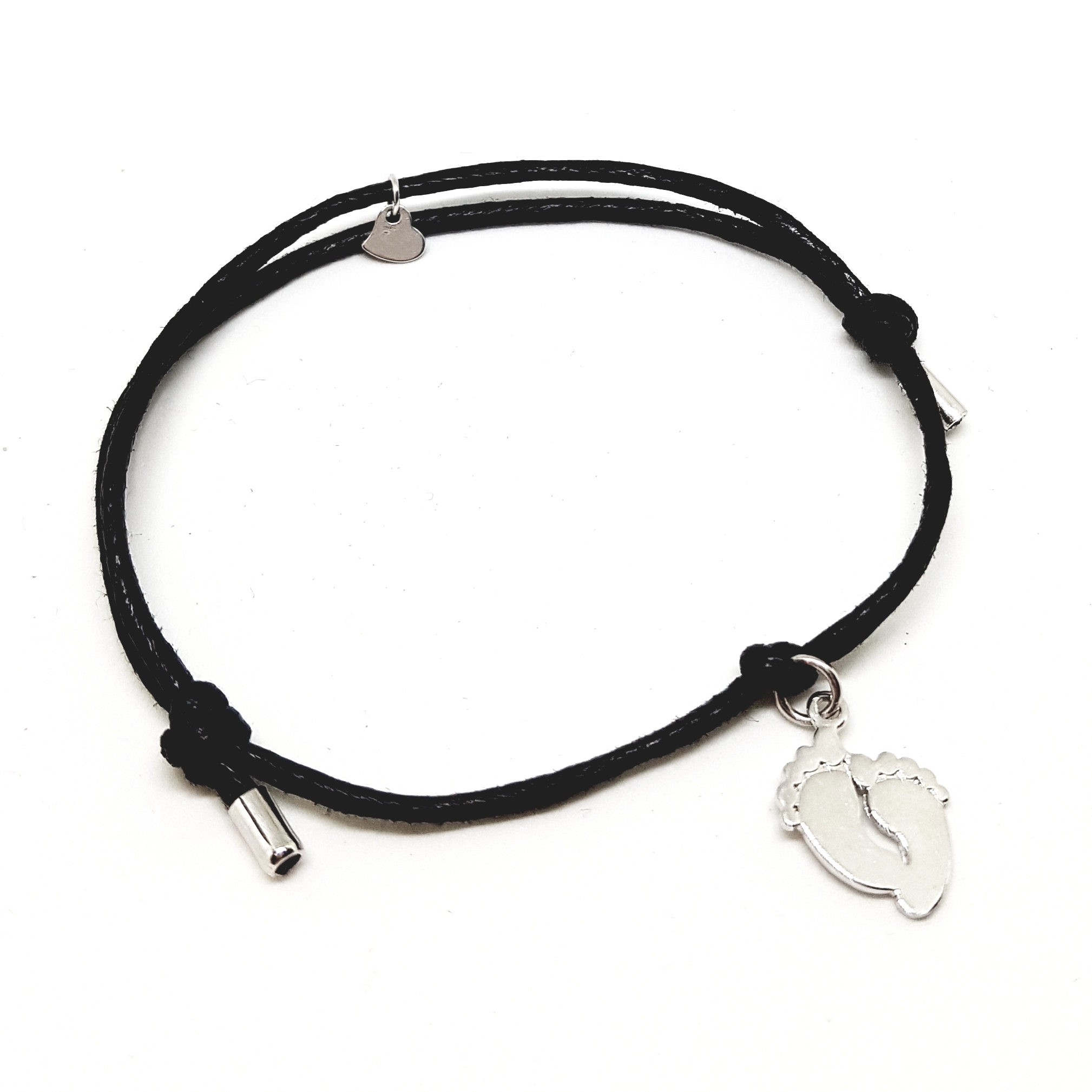 Bransoletka na czarnym sznurku ze srebrnymi stópkami