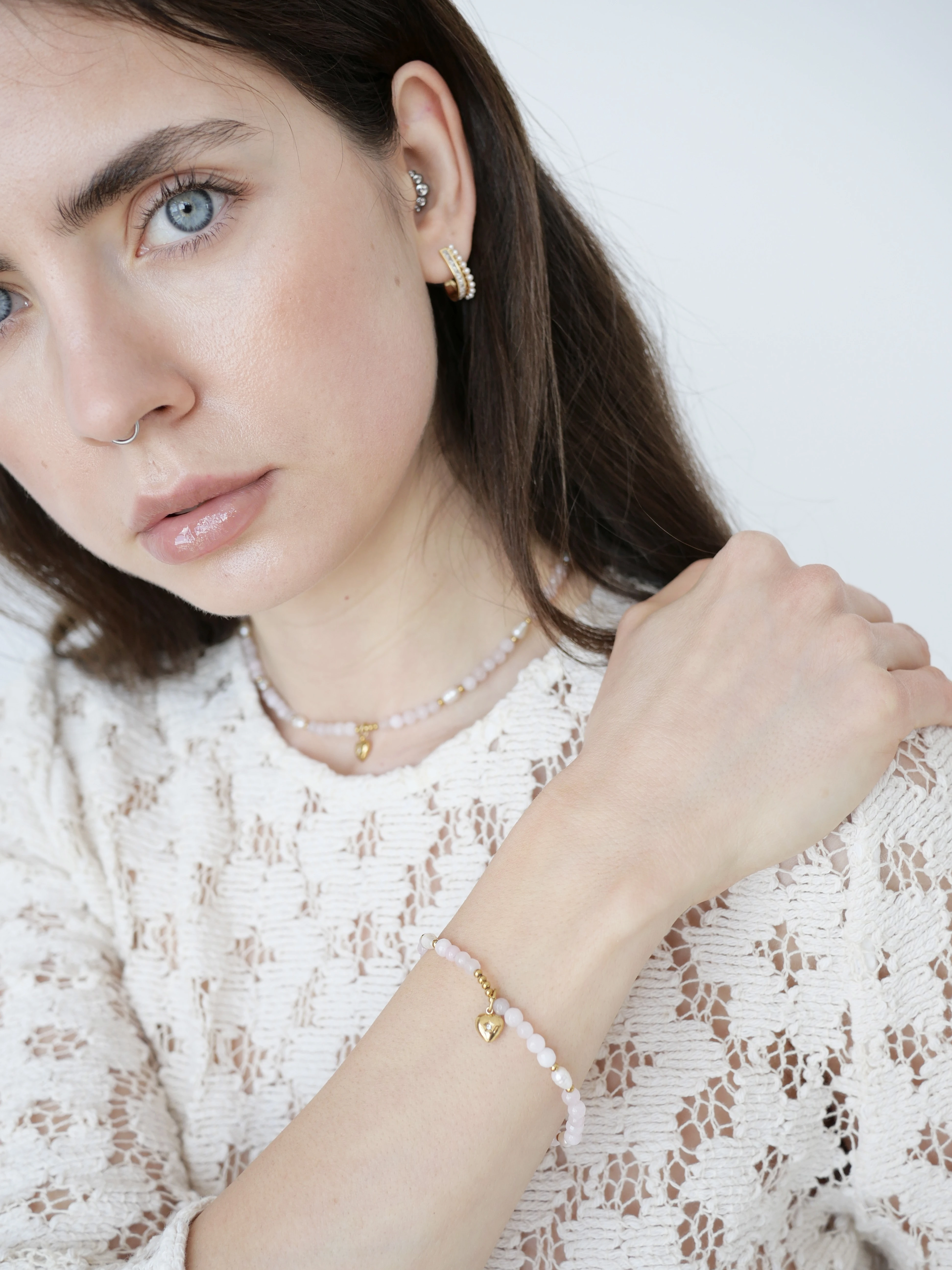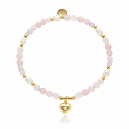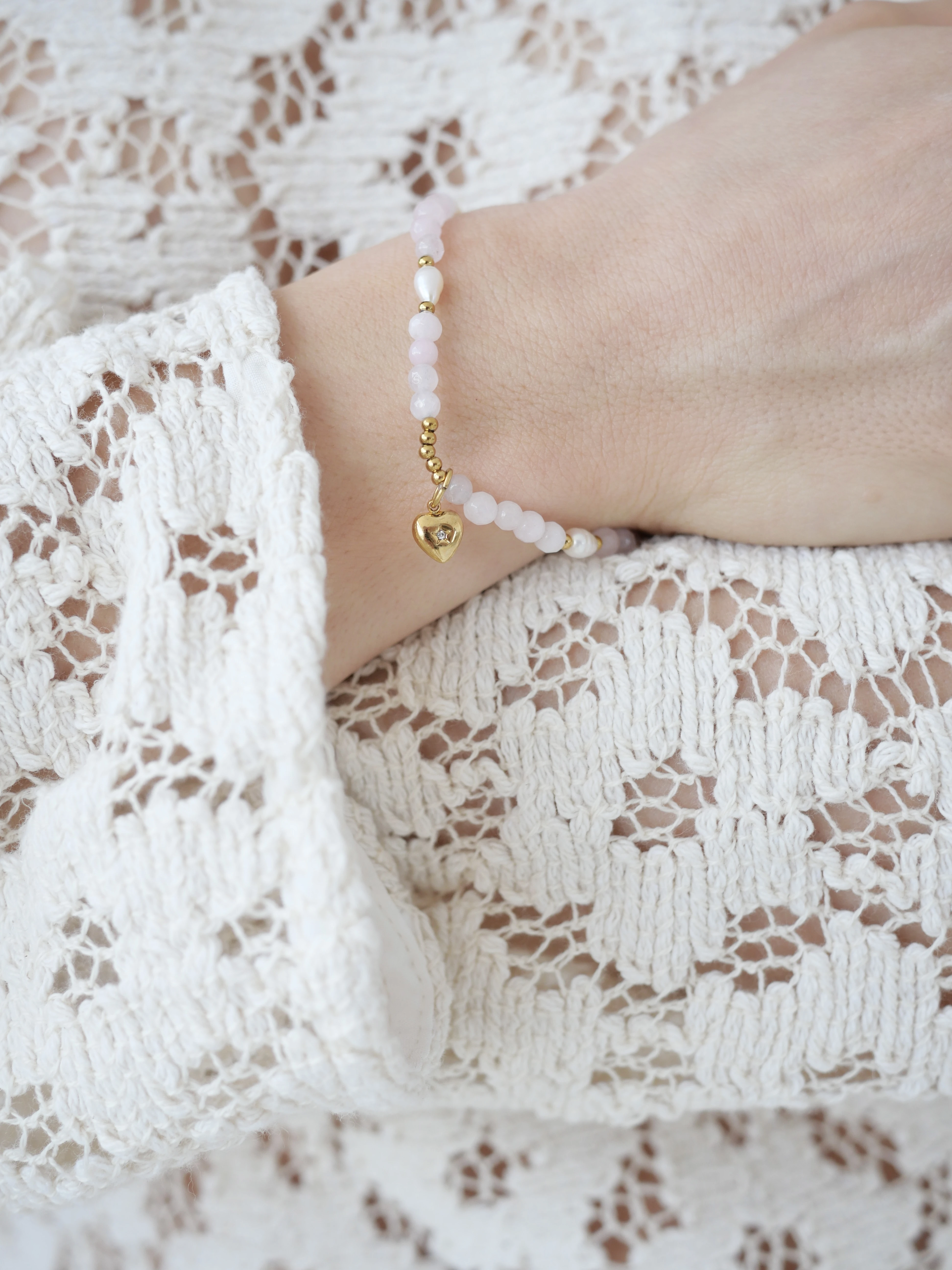 Elegancki naszyjnik i bransoletka łączące naturalne perły, kwarc różowy oraz zawieszkę w kształcie serca.