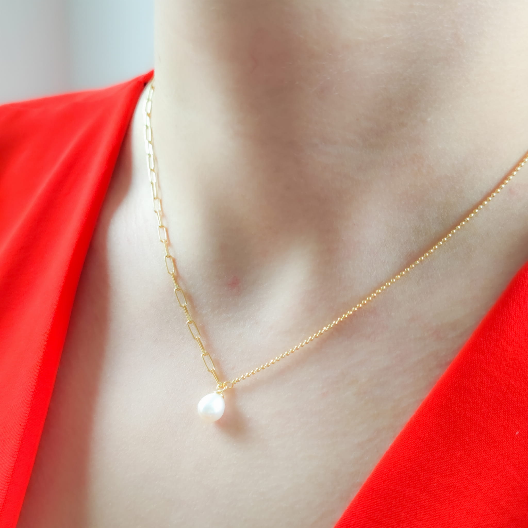 Naszyjnik srebrny DUO z naturalną perłą - pozłacany