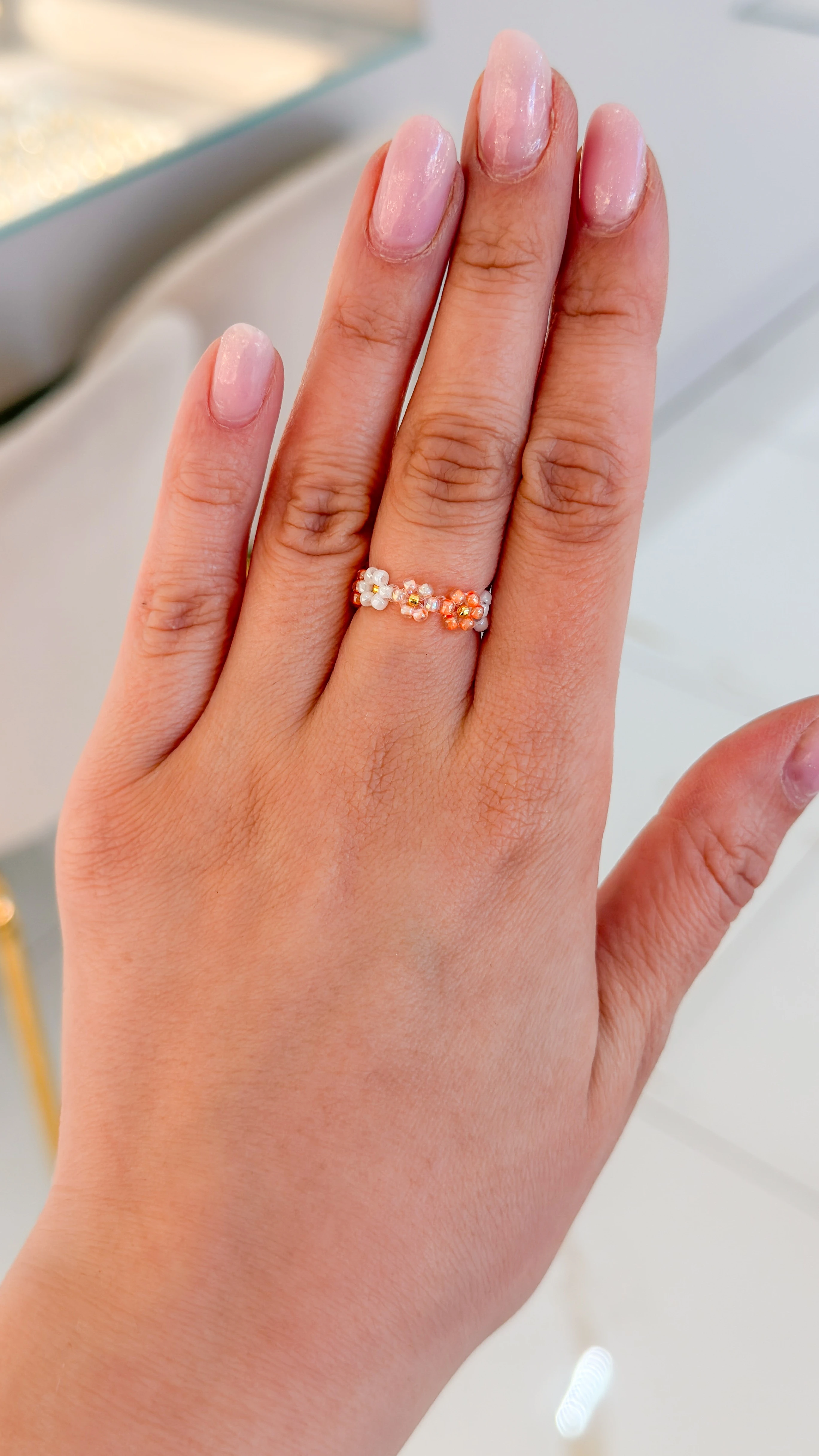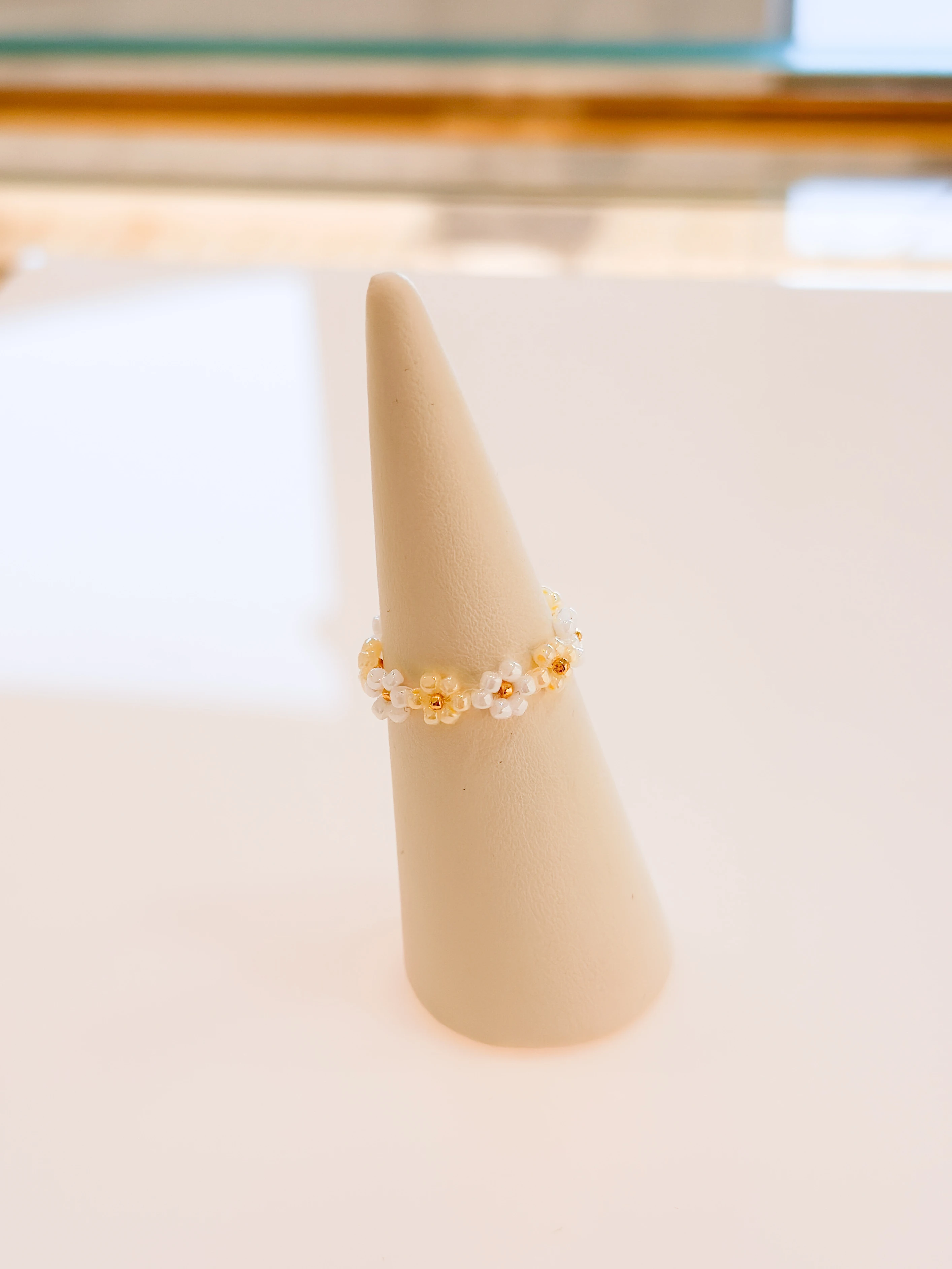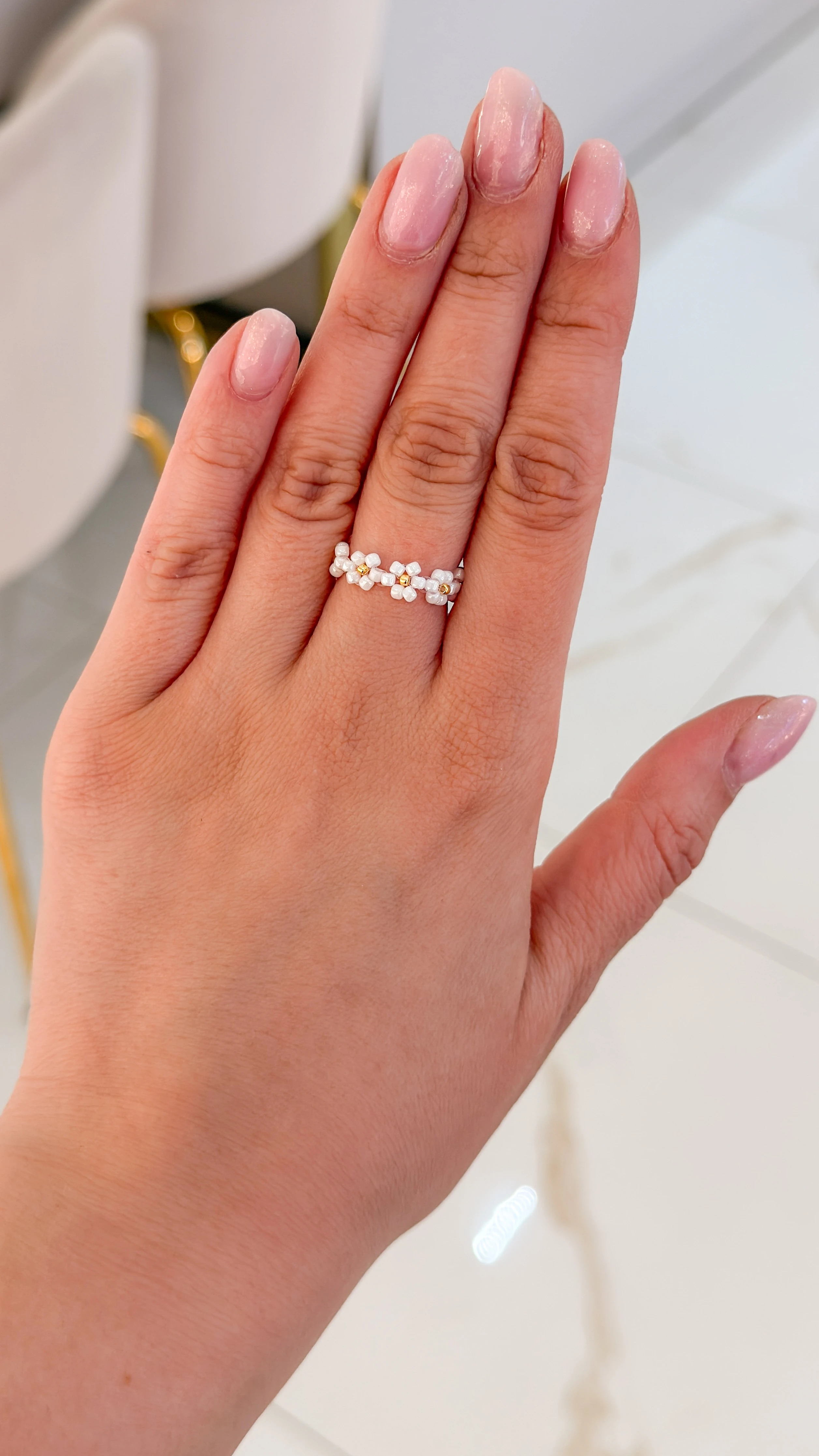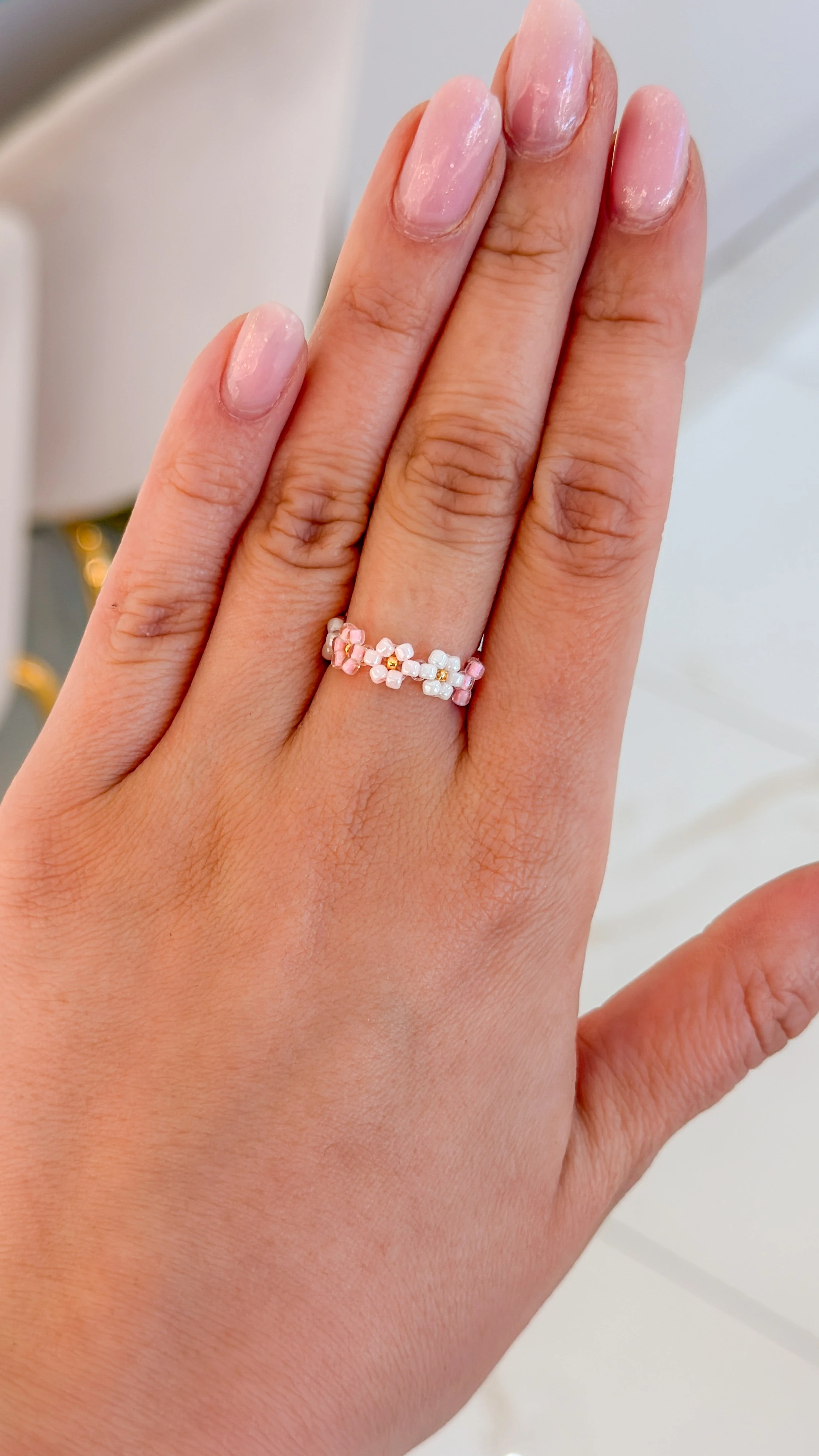 Delikatny pierścionek inspirowany kwiatami i lekkością wiosny. Subtelne koraliki tworzą formę drobnych kwiatów, które symbolizują rozwój, świeżość i kobiecą energię. Idealny jako codzienny akcent lub drobny prezent z intencją.