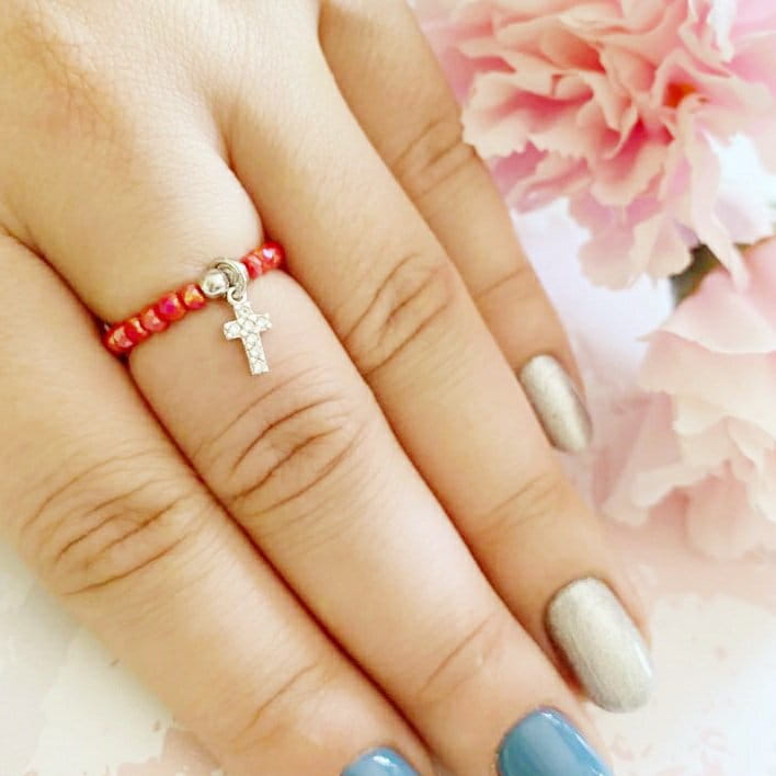 Pierścionek z czerwonych spineli z krzyżykiem i cyrkoniami