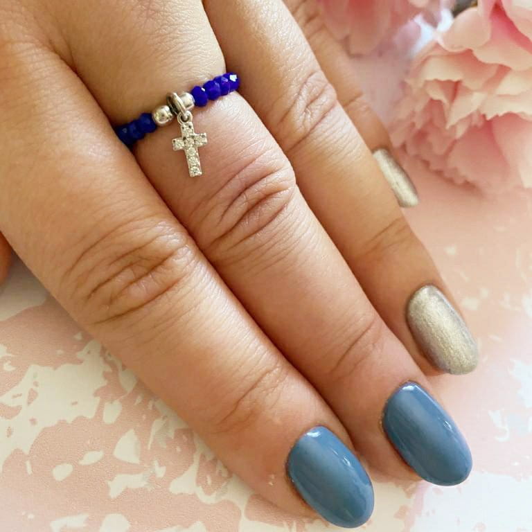 Pierścionek z niebieskich spineli z krzyżykiem i cyrkoniami