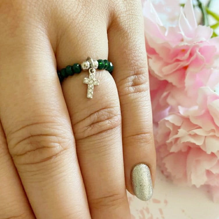 Pierścionek z zielonych spineli z krzyżykiem i cyrkoniami